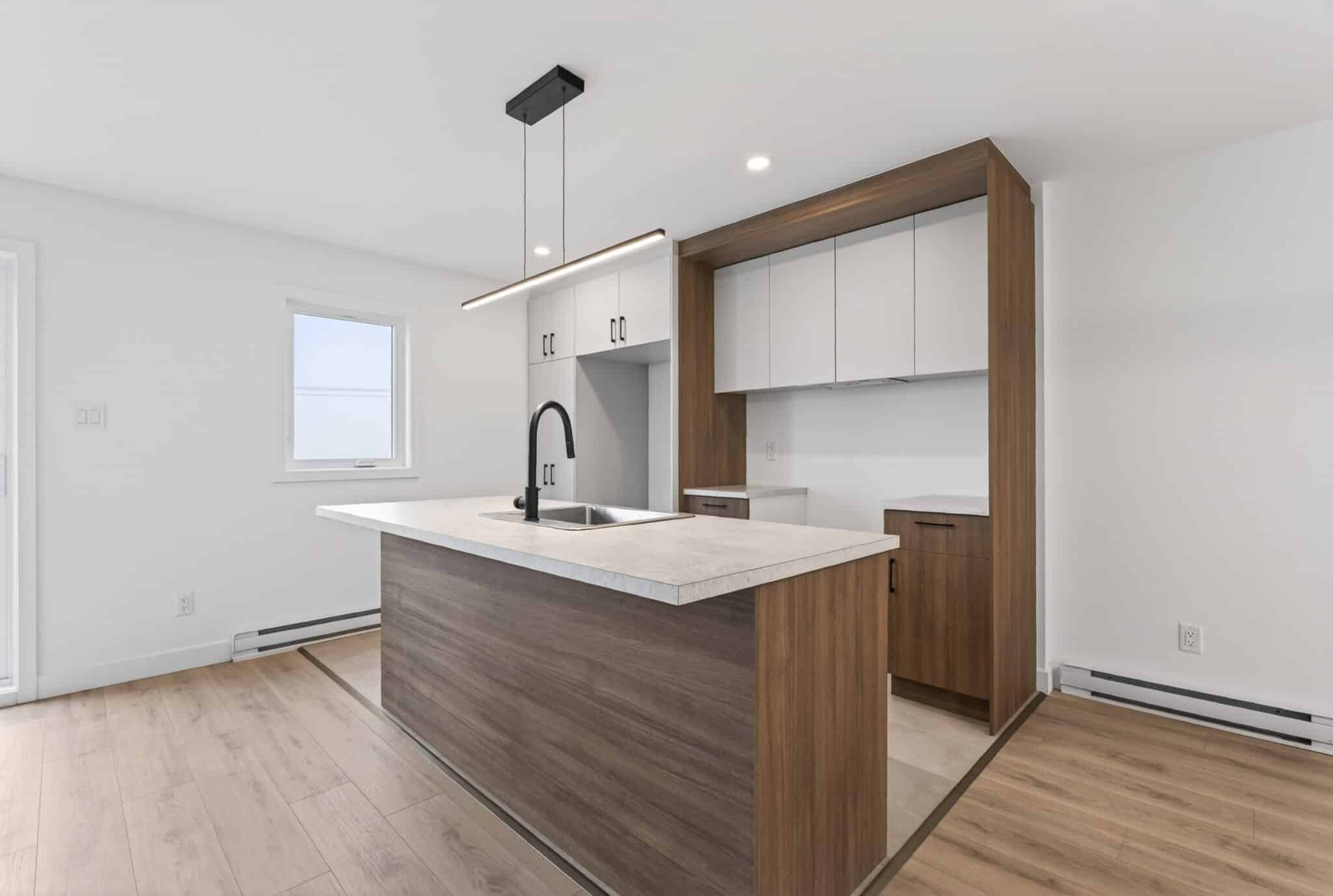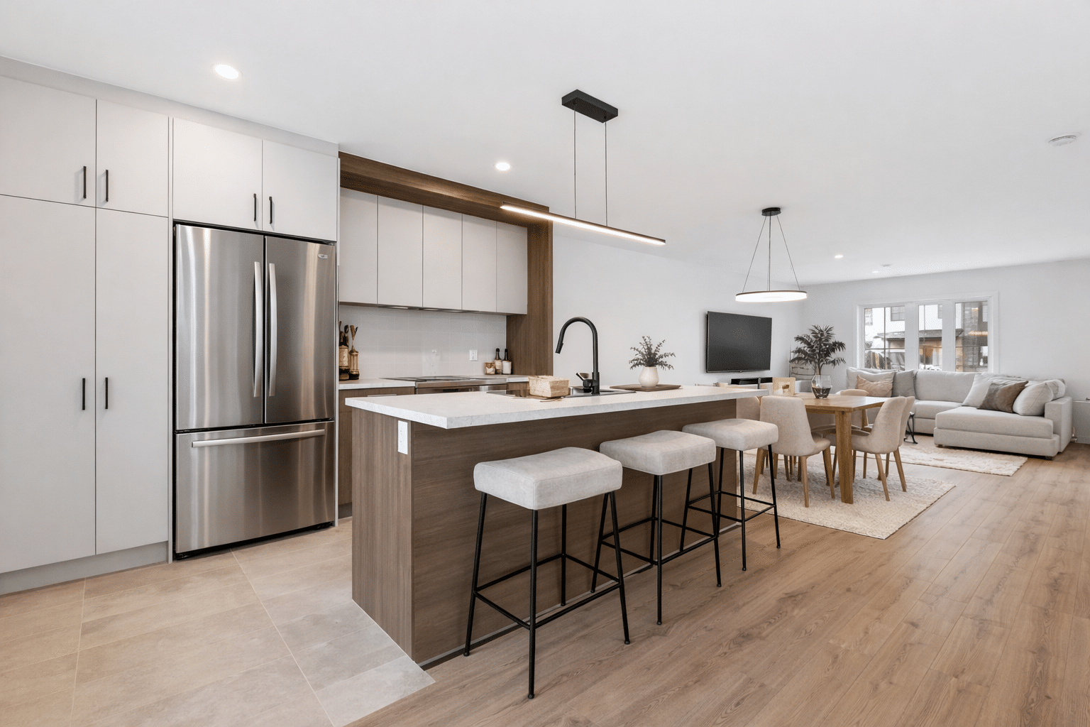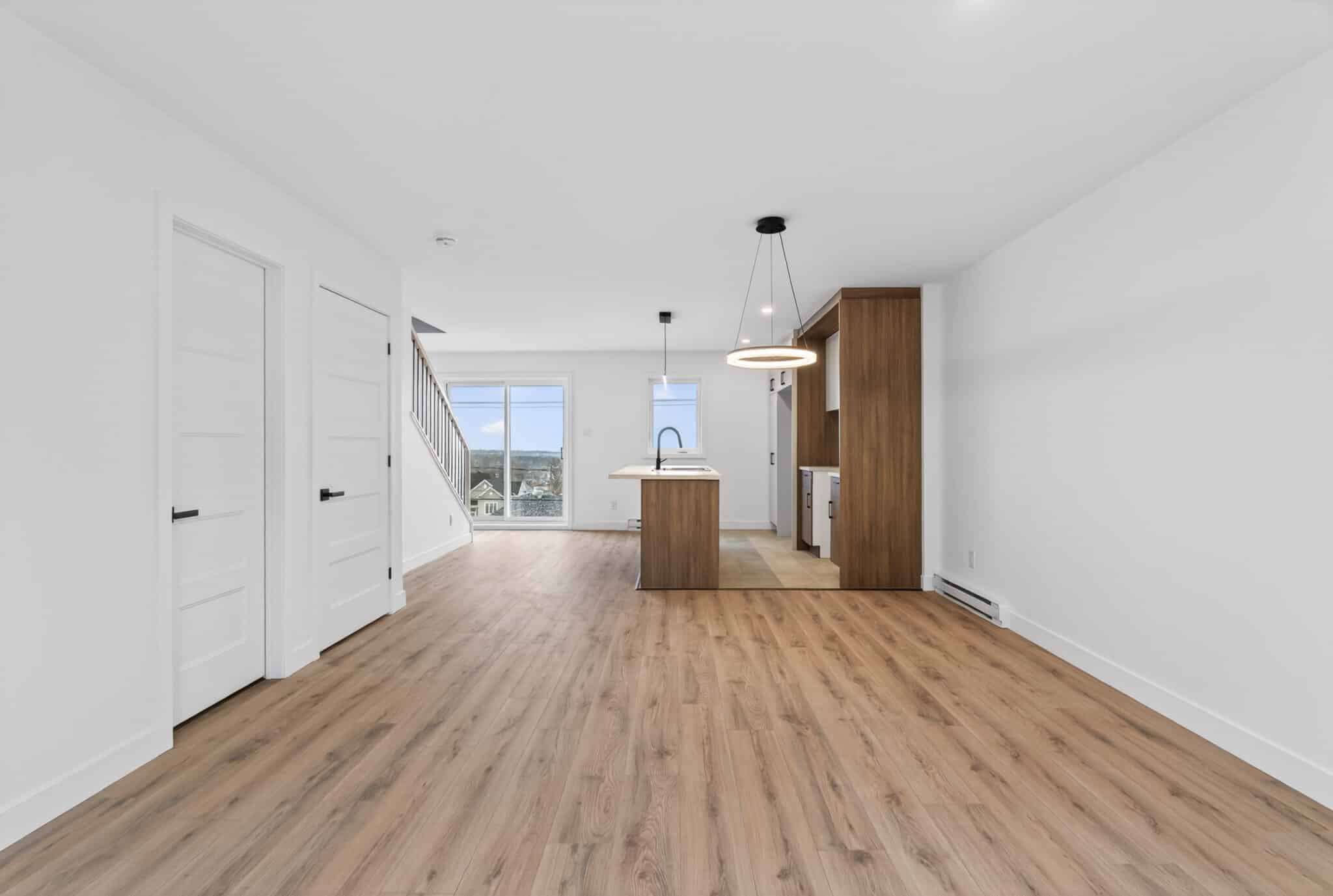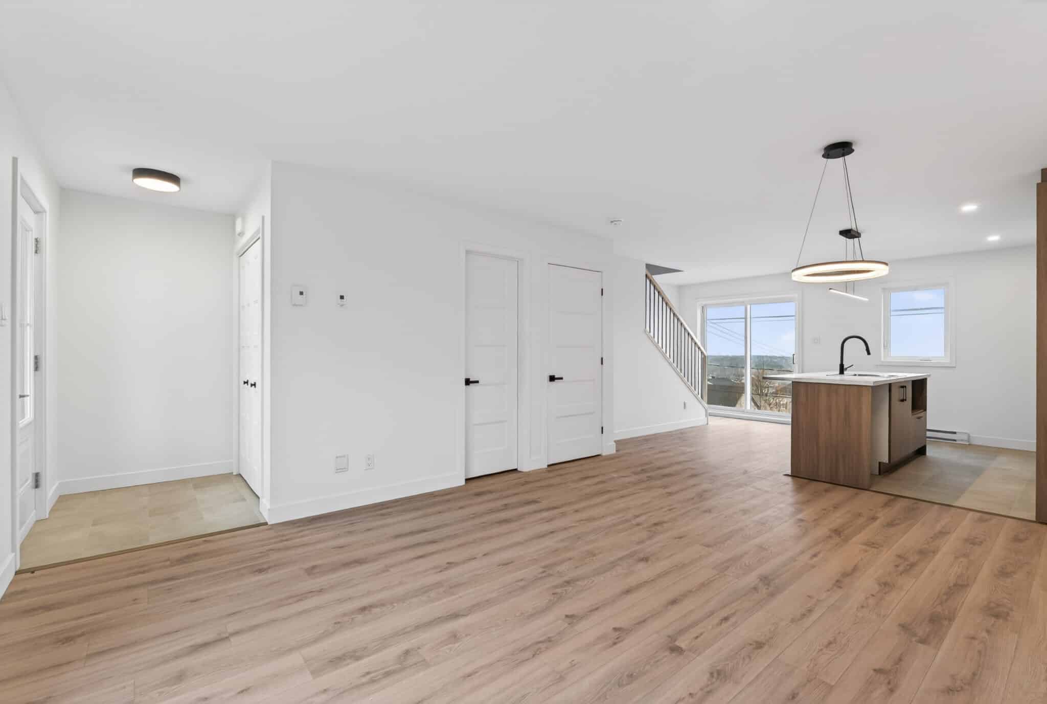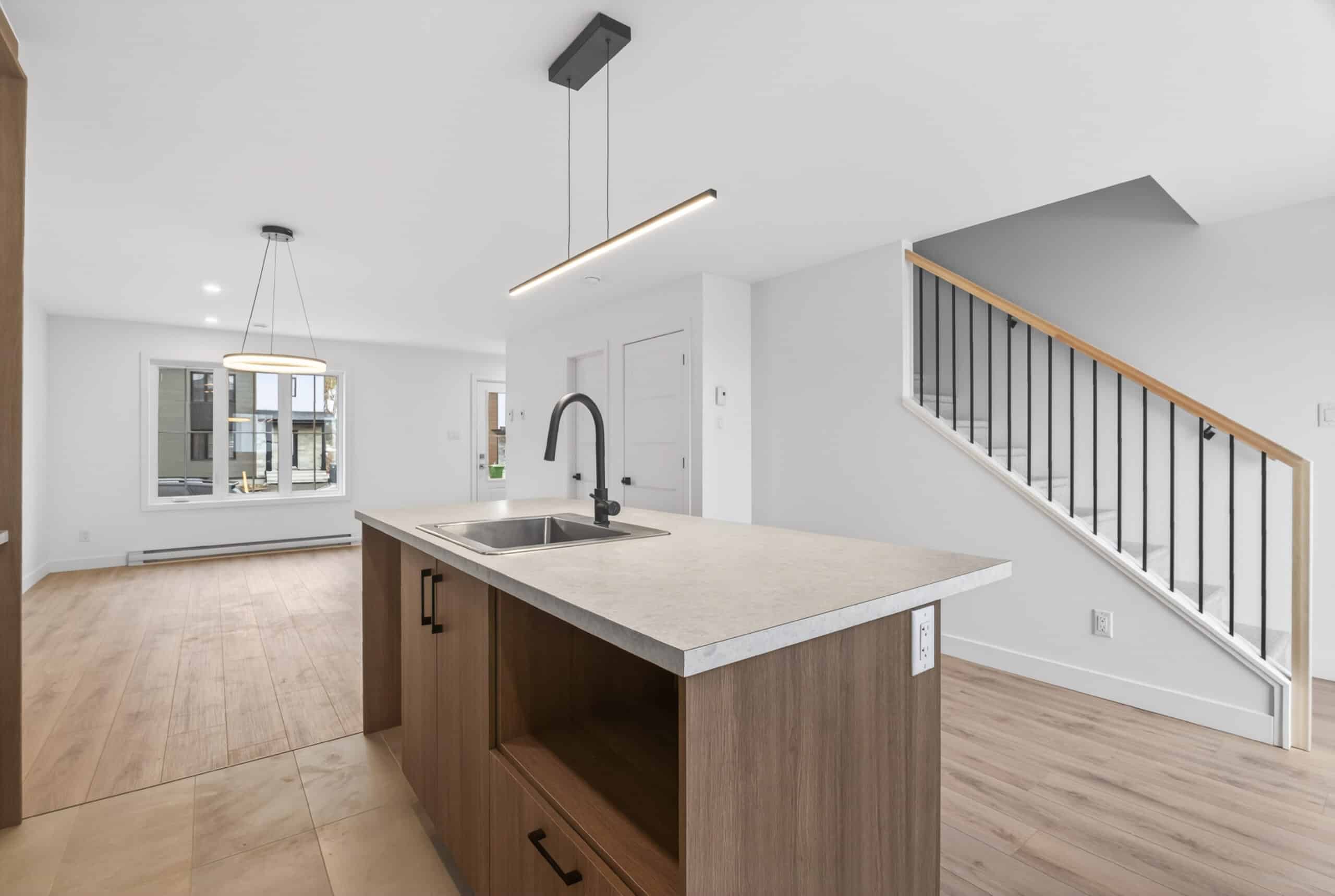 Ce modèle offre un concept à aire ouverte au rez-de-chaussée, où la cuisine moderne s’intègre parfaitement aux espaces de vie, le tout agrémenté d’une magnifique vue sur la ville.